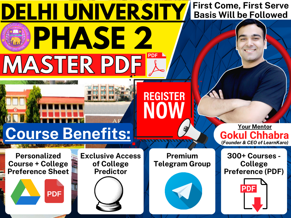You will be getting a Personalized Course + College Preference Sheet Report (PDF) within 48 hours of registration. Fill Google form in the "Announcements Tab" & fill in your course preferences. It will help you in filling DU Admissions 2022 forms - Phase 1, Phase 2 & Phase 3 Counseling Help will be provided. Other Course Benefits: 💥 How To Fill CSAS 2022 Portal - Live Sessions & Notes 💥 300+ Course-wise Preference Sheet for 70+ Colleges in DU 💥 College Predictor Exclusive Excess 💥 College Backup Options 💥 Premium Telegram Group Access There is no refund policy once you avail of the course & book the session. Please check Announcement Tab after you have purchased the course. Send a Screenshot of the payment on WhatsApp at 6397662212.