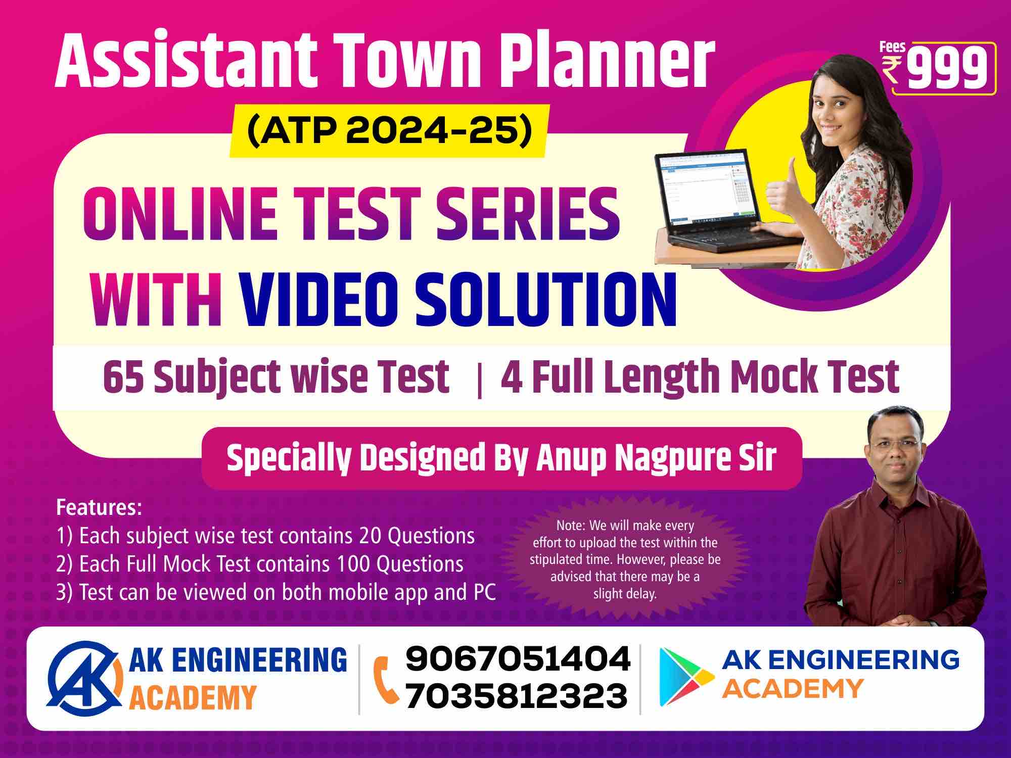๐Assistant Town Planner (ATP 2024-25) ๐Online Test Series with Video Solution ๐ 65 Subject wise Test ๐ 4 Full Length Mock Test ๐ฅ Specially Designed By Anup Nagpure Sir โจRs.999 ๐ Features: 1) Each subject wise test contains 20 Questions 2) Each Full Mock Test contains 100 Questions 3) Test can be viewed on both mobile app and PC ๐ Note: We will make every effort to upload the test within the stipulated time. However, please be advised that there may be a slight delay.
