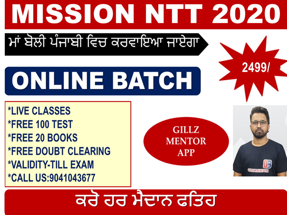 THIS IS SPECIAL CRASH COURSE FOR PUNJAB EDUCATION NTT EXAMS 2020-21 1.WE HAVE 500 SEATS ONLY 2.WE WILL COVER COMPLETE SYLLABUS AND PROVIDE YOU STUDY NOTES 3.20-FREE E-BOOKS 4.100-TEST SERIES 5.DAILY CLASS+ REVISION PDF 6. SECTIONAL TEST