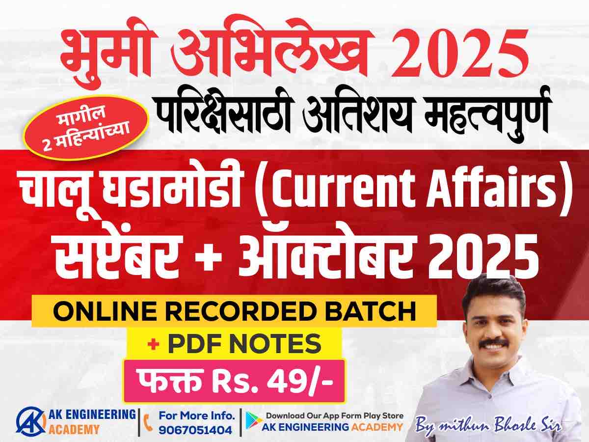 Just in Rs.49 चालू घडामोडी (Current Affairs) सप्टेंबर + ऑक्टोबर 2025 Online Recorded Batch + PDF Notes (मराठी भाषेत) फक्त Rs. 49/- Note: व्हिडिओस 7 नोव्हेंबर 2025 ला अपलोड होतील. Validity: 1 month ची validity दिलेली आहे. त्यांनतर तुम्हाला परत त्या वेळी जी fees असेल ती pay करून renew करावे लागेल.